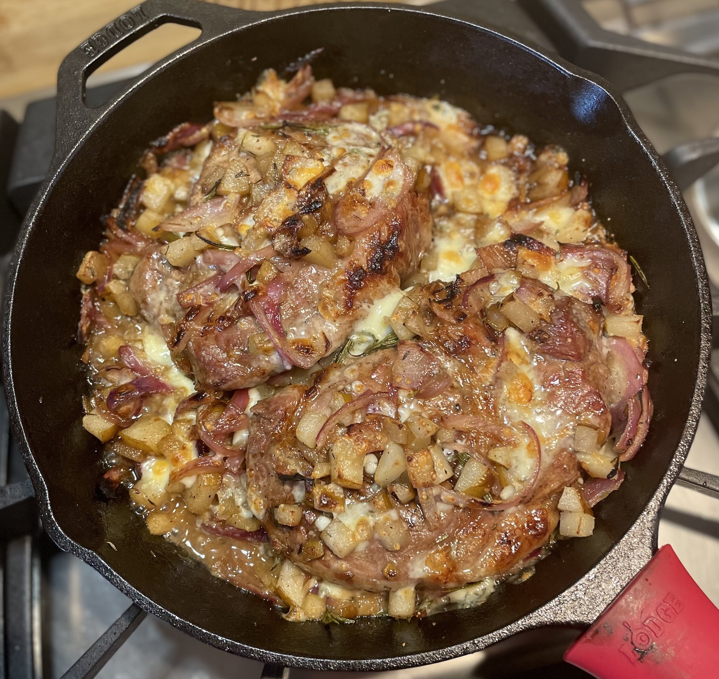 Pork Steak with Pears, Blue Cheese & Red Onion